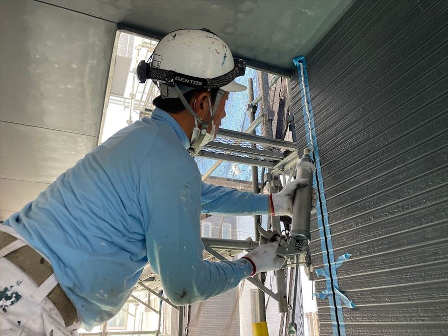 次に、プライマーを均一に塗布してシーリング材の密着性を高め、専用のコーキングガンを用いて充填していきます。